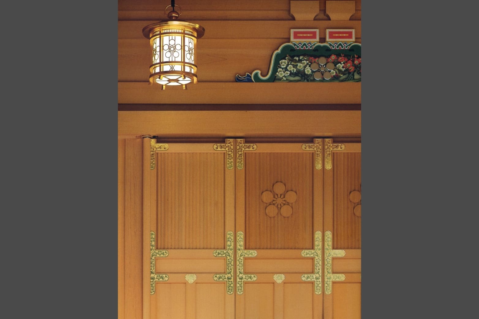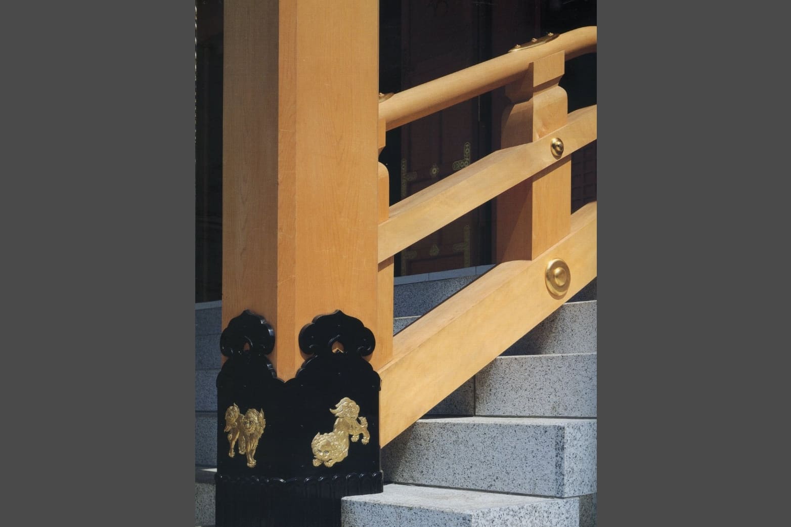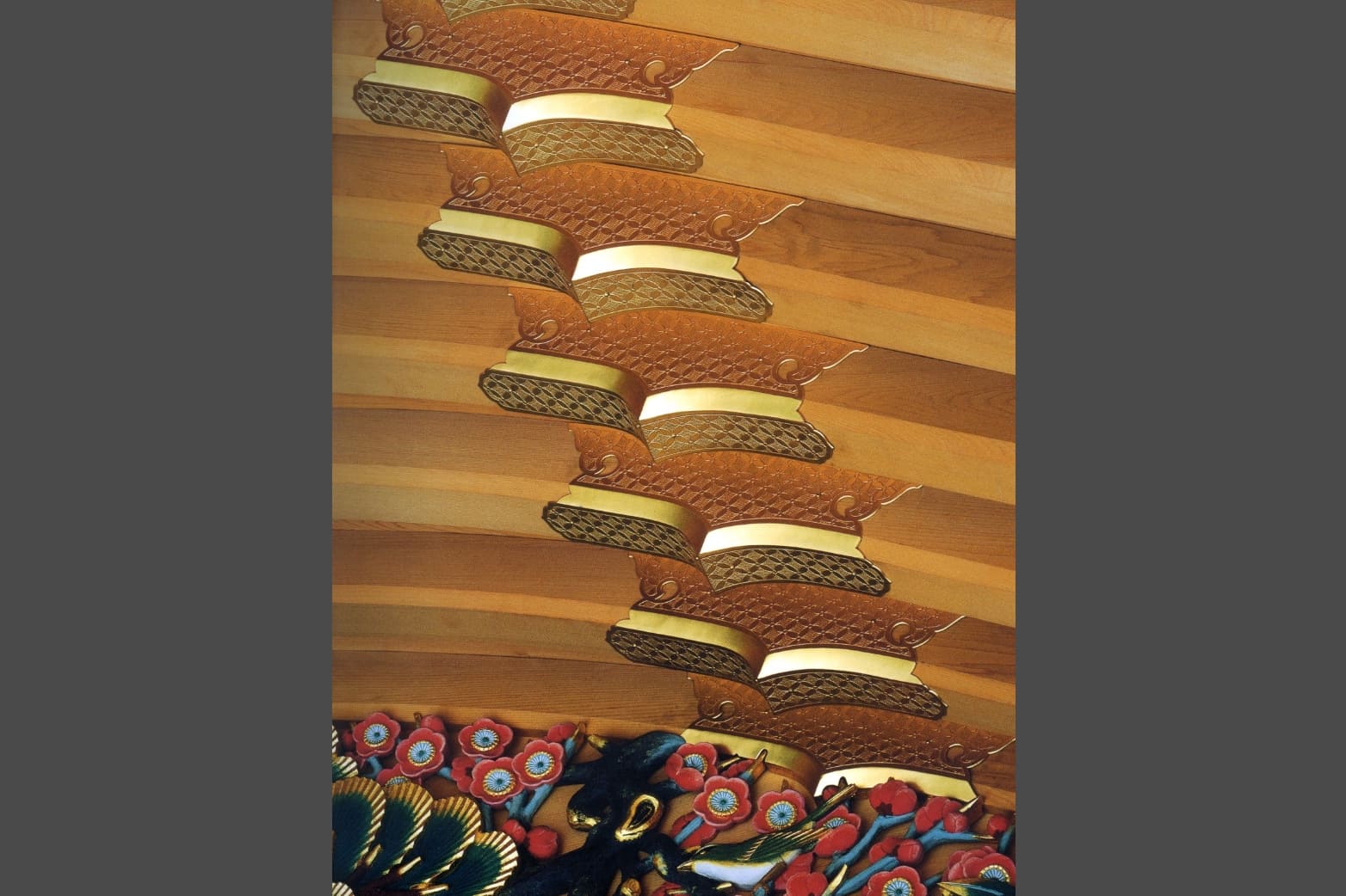 湯島天神本殿の御造営において、総檜造りの社殿を彩る錺(かざり)金具を担当いたしました。厚手の銅板に「水銀アマルガム鍍金」を施し、「なめくり彫り」や「魚々子(ななこ)」などの高度な伝統技法を駆出しています。錺金具は、日本髪を彩る「簪(かんざし)」のような存在。私たちが最後に取り付けることで、初めて建築美は完成します。「昔以上のものを残す」という気概で挑んだ、平成の金工技術の結晶です。