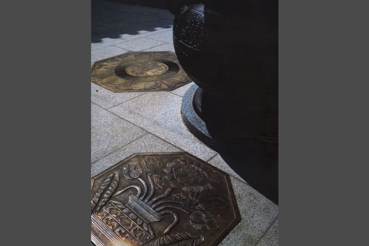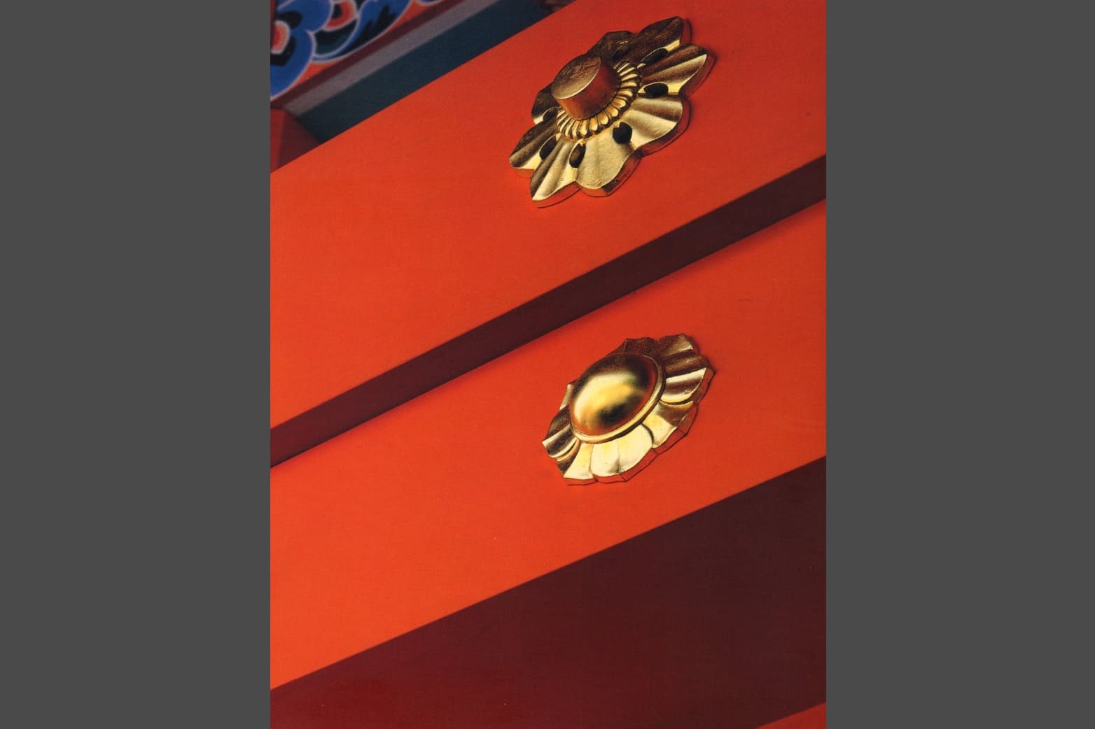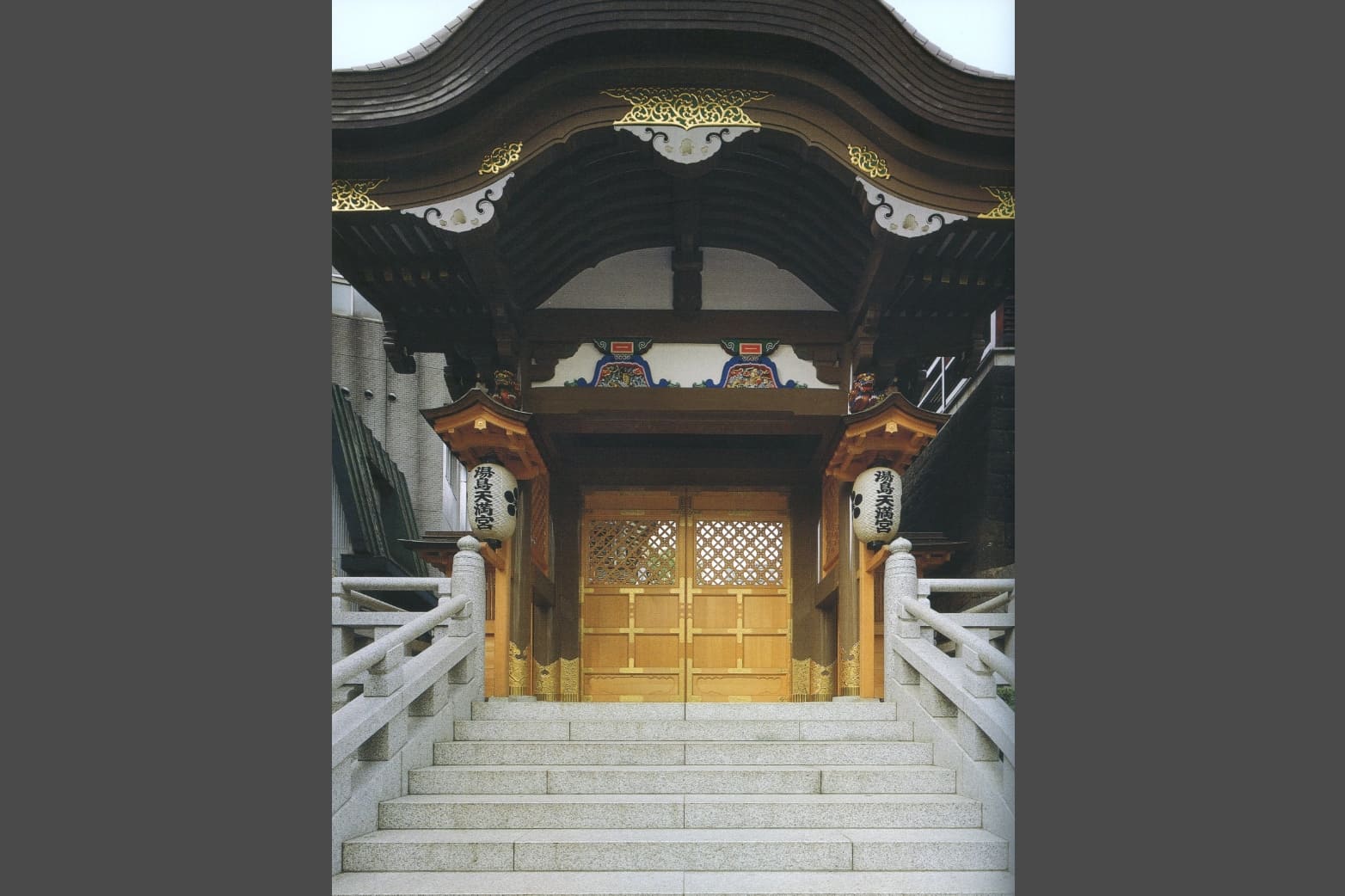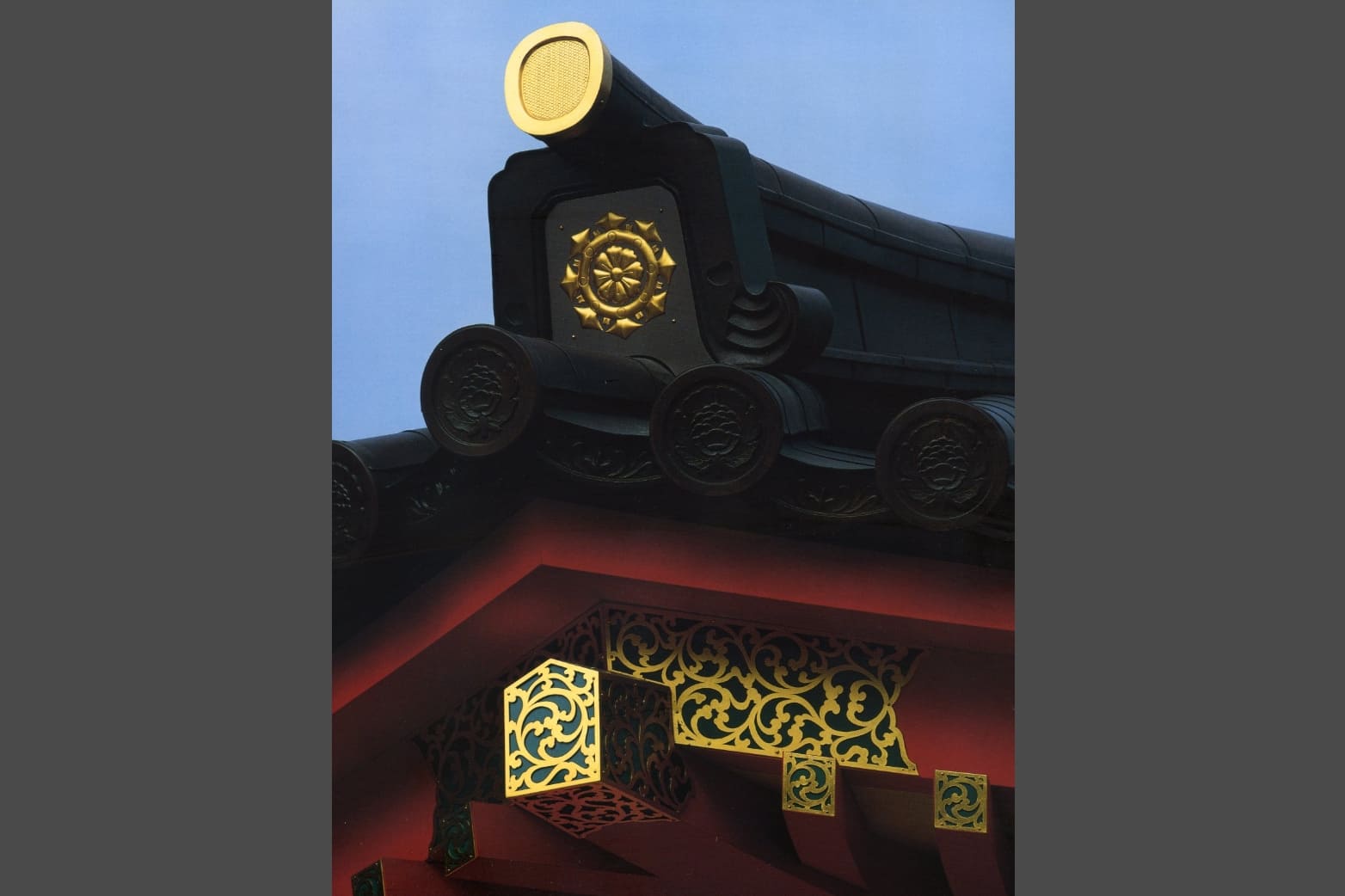 湯島天神本殿の御造営において、総檜造りの社殿を彩る錺(かざり)金具を担当いたしました。厚手の銅板に「水銀アマルガム鍍金」を施し、「なめくり彫り」や「魚々子(ななこ)」などの高度な伝統技法を駆出しています。錺金具は、日本髪を彩る「簪(かんざし)」のような存在。私たちが最後に取り付けることで、初めて建築美は完成します。「昔以上のものを残す」という気概で挑んだ、平成の金工技術の結晶です。