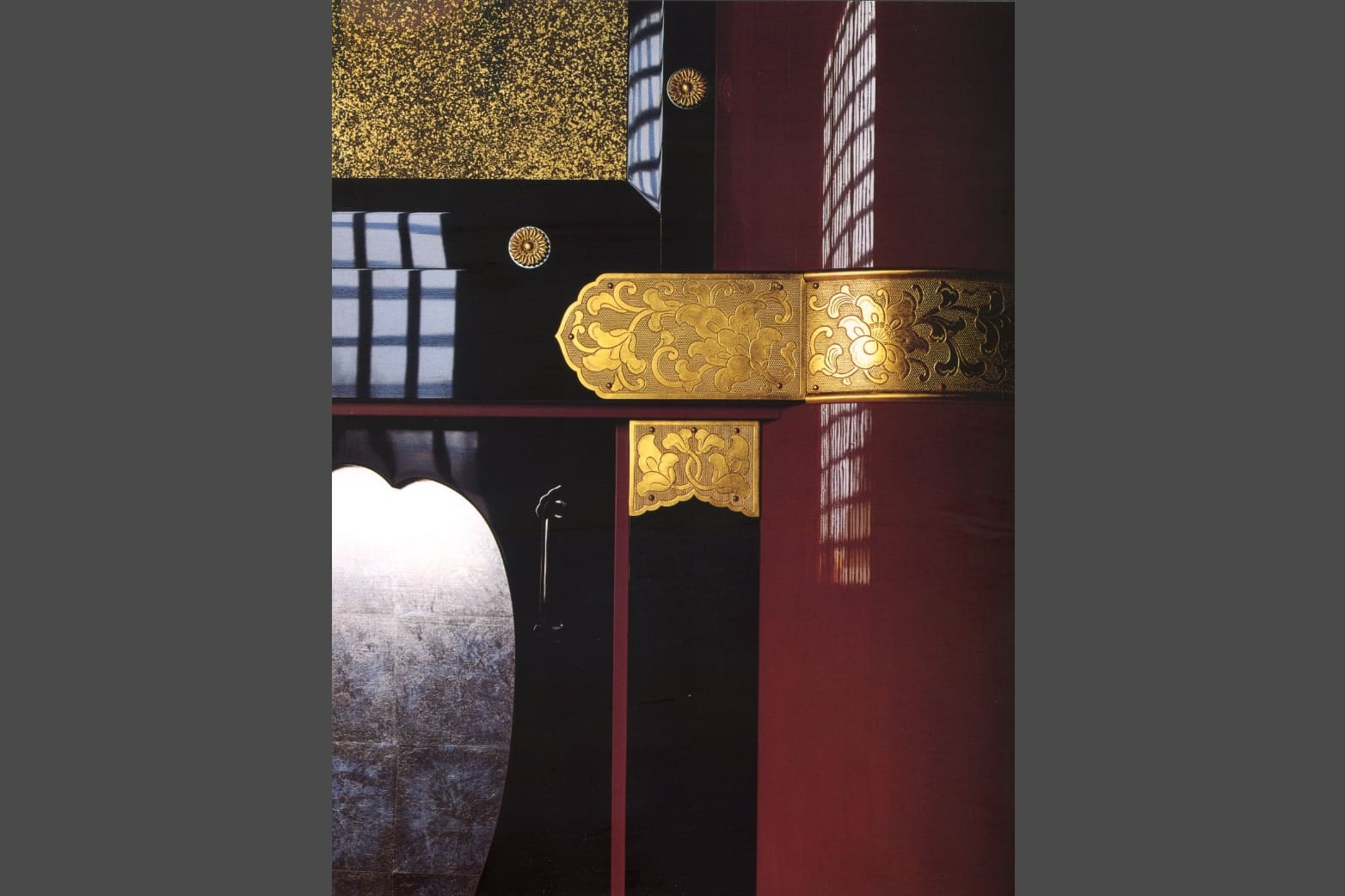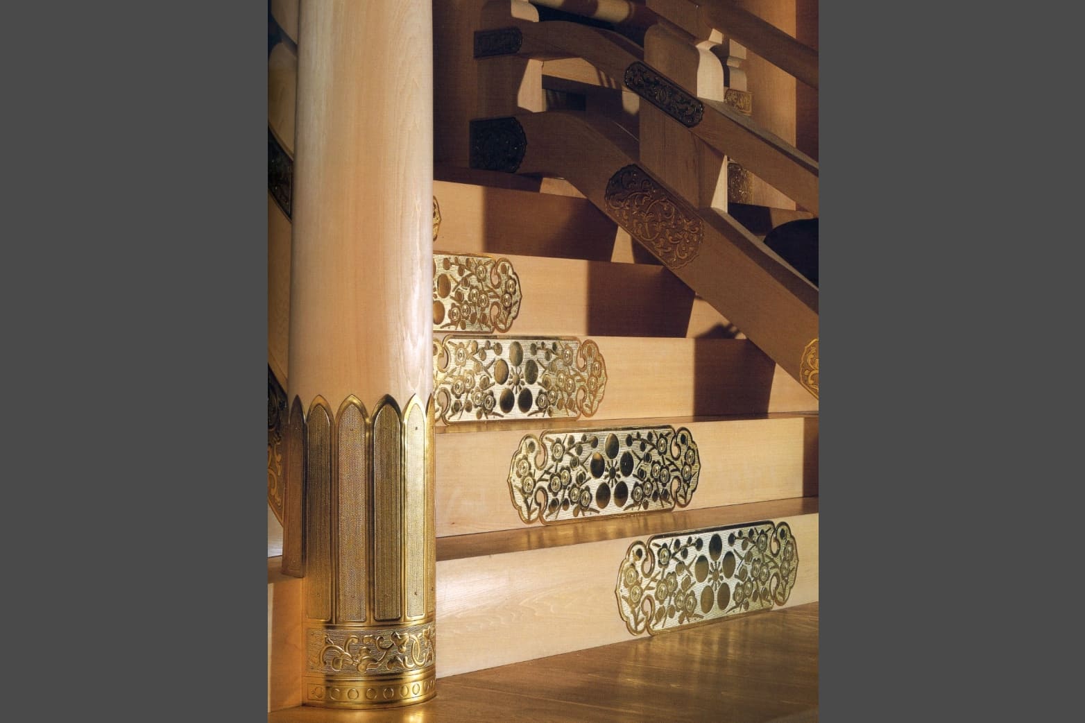 歌舞伎発祥の地・京都南座の改修にあたり、建物内外すべての錺(かざり)金具を担当いたしました。コンセプトは「昭和初期の復元と近代性の融合」。外部金具は漆と金箔で往時の輝きを取り戻し、内部は意匠を一新して現代的な荘厳さを創出しました。膨大な点数ながら全て手作業による一品製作を貫き、開場当日の朝まで調整を重ねる妥協なき仕事で、歴史的劇場の再生を支えました。