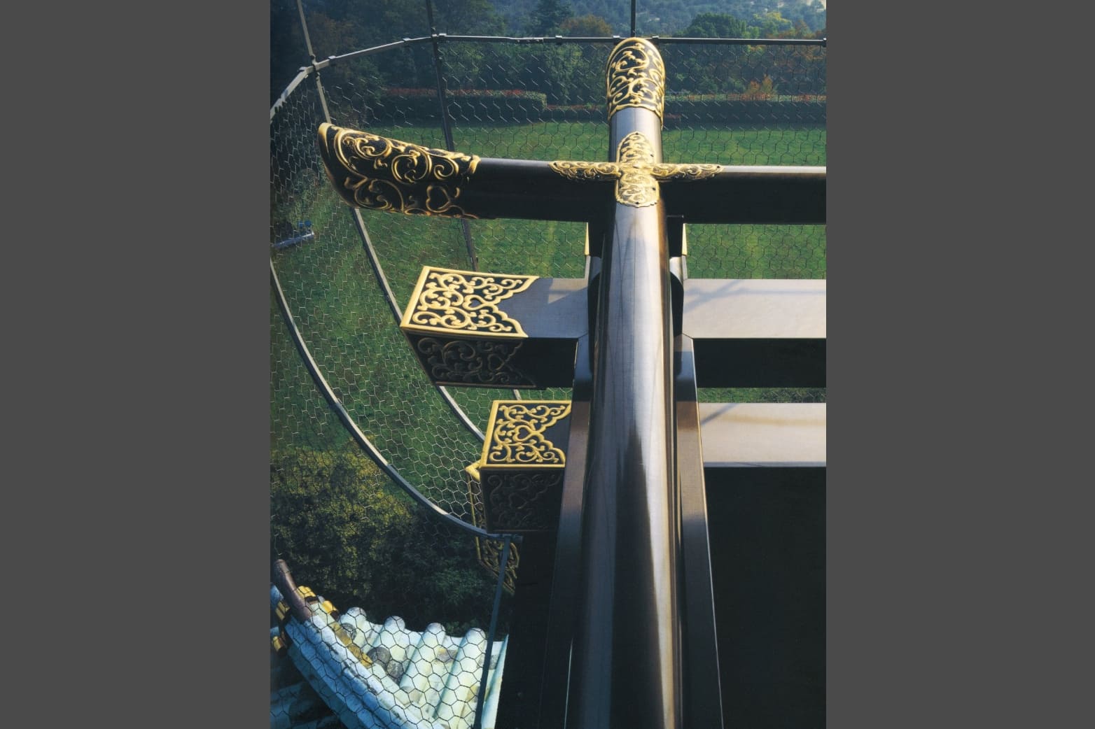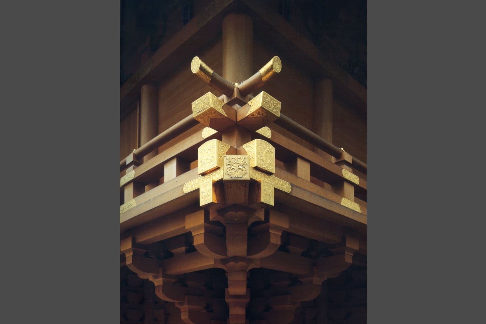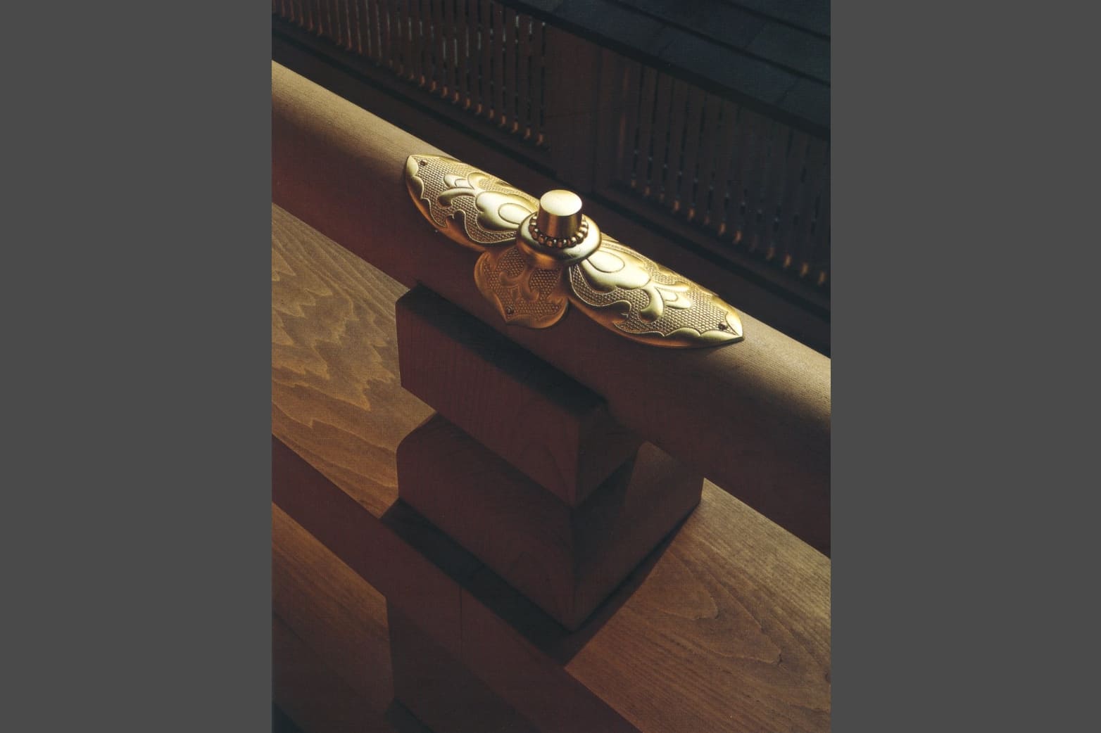 第61回神宮式年遷宮において、内宮・外宮をはじめ14別宮の錺(かざり)金具製作を拝命しました。膨大な点数に及ぶ金具は、すべて正倉院の古文書に由来する伝統意匠。現代建築への挑戦とは対照的に、ここでは徹底して古来の技法に徹しました。 遷御の夜、月明かりの中で鈍く輝いた黄金色は、日本建築の簡素な美と荘厳さそのもの。1300年続く祈りの歴史を、確かな技術で支えられたことは私たちの誇りです。